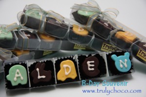 Souvenir ulang tahun anak terbuat dari coklat dengan bentuk yang lucu dan warna ceria yang ditulis dengan nama panggilan ananda ini akan menjadi souvenir ultah yang unik saat pestas ulang tahun mereka.
