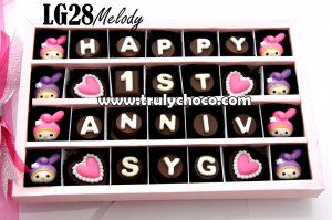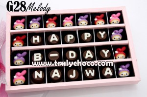 • G28 Melody : Paket chocogift isi 28pcs dengan hiasan coklat melody  Harga  (tutup mika Rp. 110.000, KODE : G28 melody), ( tutup hardcover Rp. 125.000 KODE : EG28 melody)