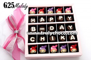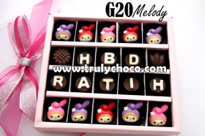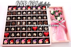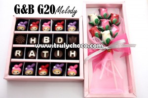 • G&B G20 Melody : Paket chocogift isi 20pcs dengan hiasan coklat my melody dan choco bouquet (hanya ada tutup mika: Rp. 160.000),