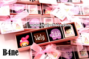 • B4ne melody : souvenir coklat cantik isi 4 pcs dengan bentuk coklat my melody , nama anak yang ulang tahun, umur anak dan foto edible anak yang lucu, Harga Rp. 10.800 / Packs, min order 50packs